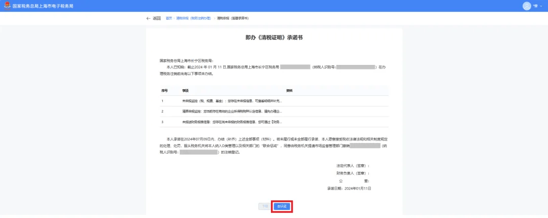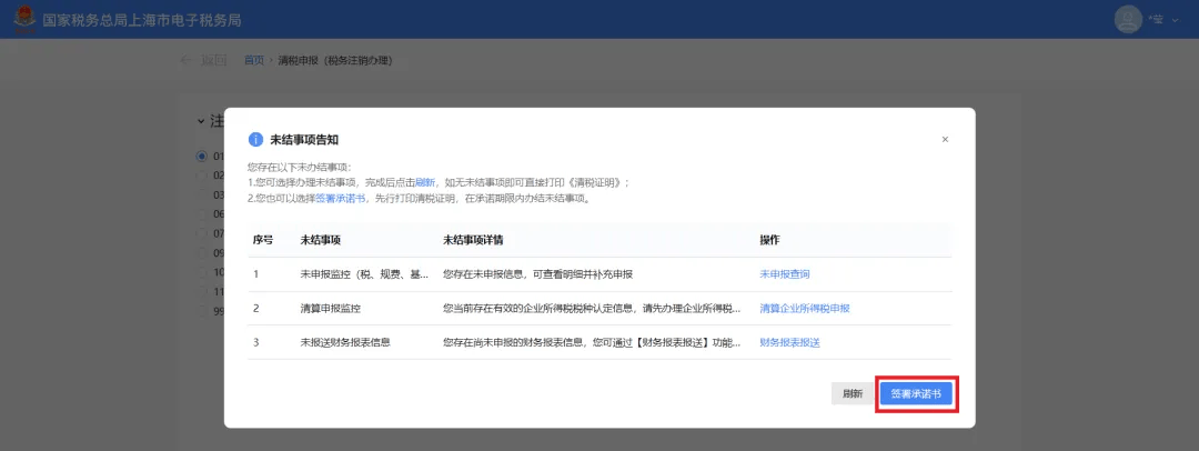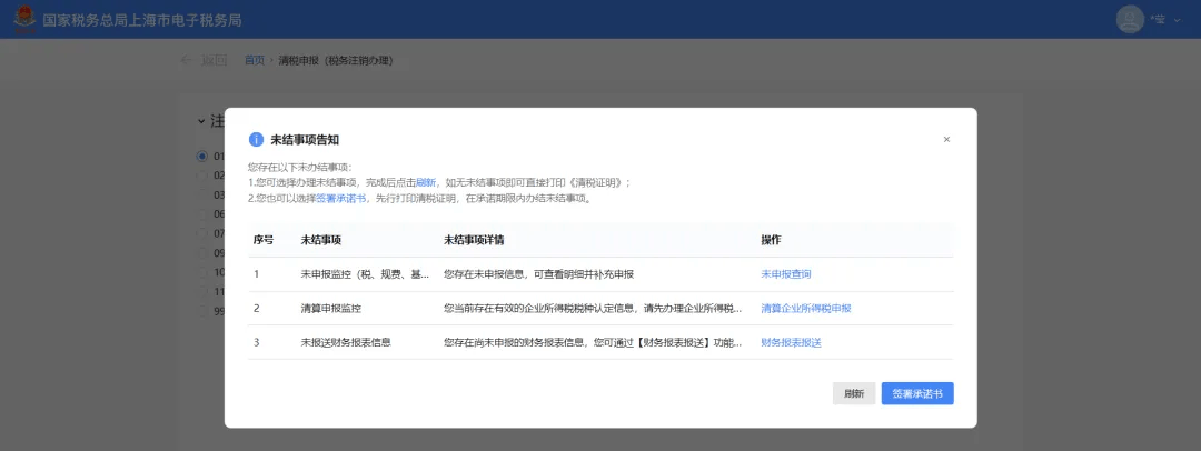 ②您也可能遴选签订应允书,先行打印清税证实,正在应允克日内办结未结事项。”,浮现未结事项以及对应料理链接按钮。