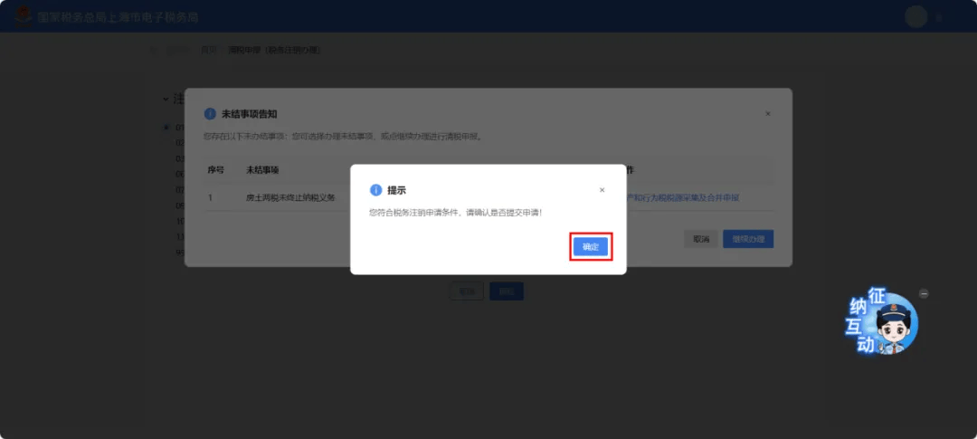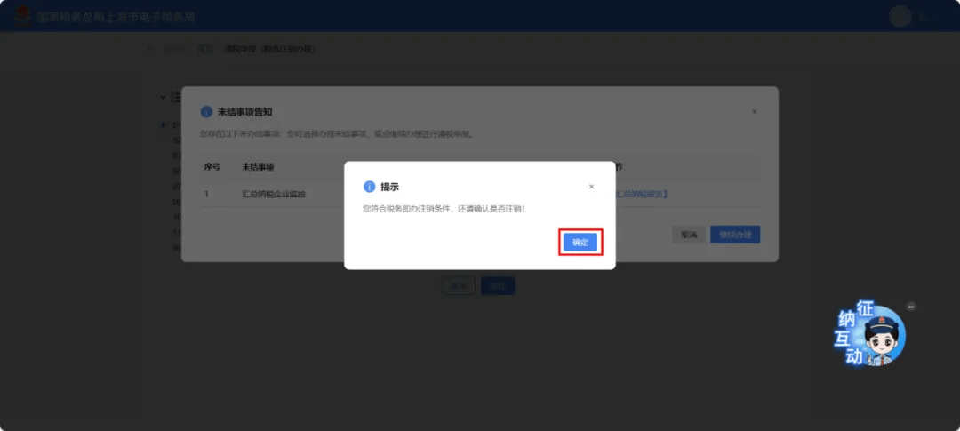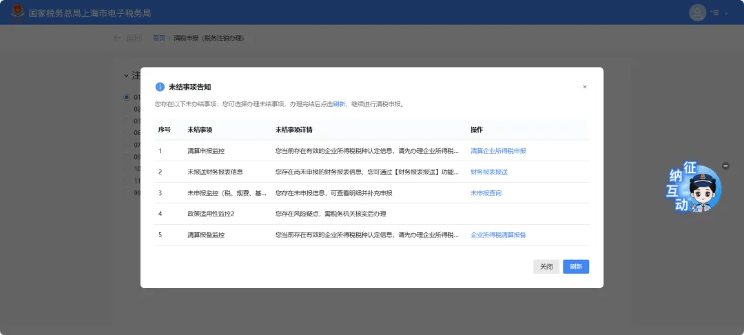 点击未结事项对应的料理体例按钮,体例跳转到未办结的生意效力,结束未结事项料理后,从新进入“清税申报(税务刊出料理)”效力,结束清税流程操作。