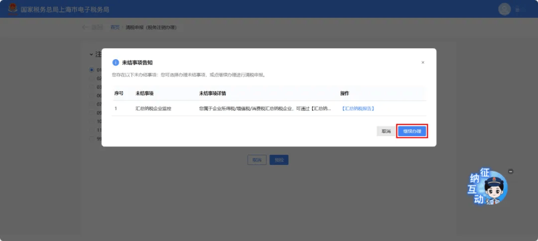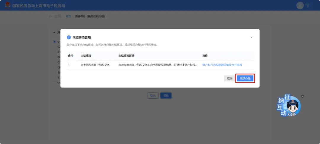 ①体例弹出未结事项见知界面,体例提示“您存正在以下未办结事项:您可遴选料理未结事项,或点赓续料理举办清税申报。”,浮现未结事项以及对应料理链接按钮,点击【赓续料理】。