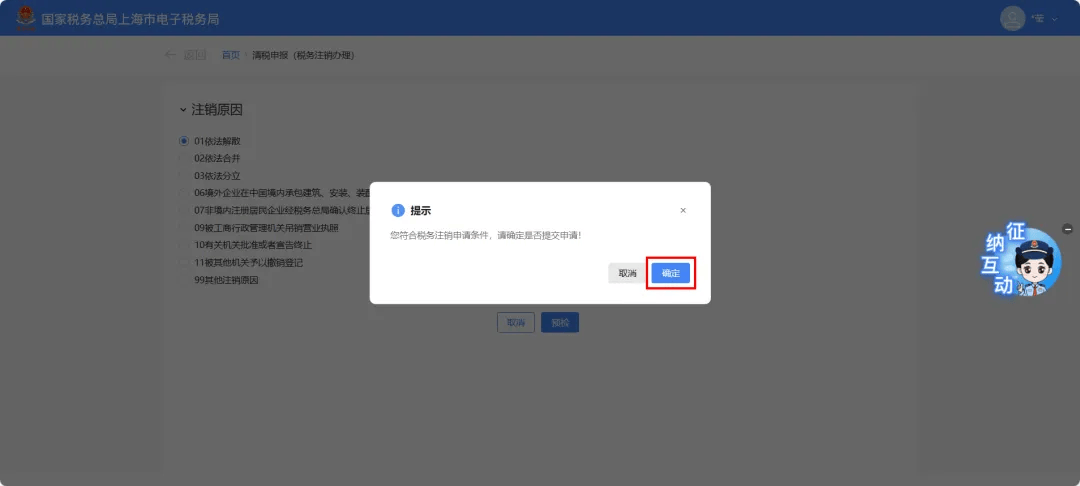 ②体例提示“您适应税务刊出申请要求,请确定是否提交申请!”,点击【确认】。